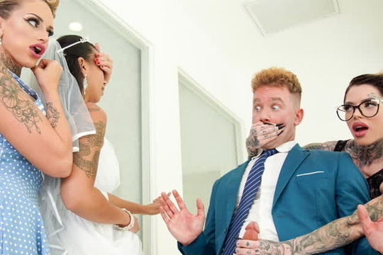 החברות המקושטות של הכלה מזדיינות עם החתן לפני החתונה